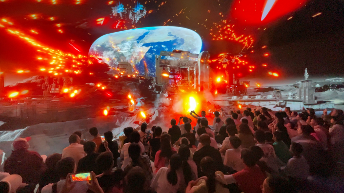 这一转变的背后,是超元力自主研发的核心技术体系支撑。剧场采用国内首创的弧形CAVE系统,五面屏幕通过弧形柔性屏无缝衔接,彻底消除了早期直角拼接的折痕与画面变形,实现了视觉上的浑然一体。结合超10K原生素材点对点输出与独家专利的像素融合技术,确保每帧画面都能精准匹配LED灯珠,呈现准CG电影级的震撼画质。硬件上,从稳固的钢结构箱体、超白玻璃桥、深渊镜观影台,到5.1环绕音响与梦幻星空顶,共同构建了视觉、听觉、体感的多维沉浸环境。软件与硬件的深度耦合,使得《齐天大圣》、《星际奇遇》、《飞越中国》等独家影片得以完美呈现,每部6-10分钟的精彩叙事,高效承载文化IP,瞬间将游客带入另一个世界。