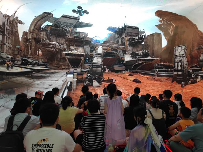 步入元宇宙剧场,游客将经历一次感官认知的刷新。剧场采用专业视觉工程系统,在通透的建筑结构上实现裸眼3D视觉效果,无需穿戴设备即可获得全景沉浸体验。与传统观光项目不同,元宇宙剧场实现了多重技术协同——CAVE弧形屏幕与深渊镜的精准配合,创造出从地面延伸至天空的无边界视觉场域;智能灯光与音响系统随内容情节实时变化,构建完整的氛围叙事。游客在6-10分钟的体验中,既可穿越壮阔自然景观,也可探索科幻未来世界,这种超越常规观光的体验方式,使其迅速成为景区内的热门打卡点,有效激发游客的社交媒体传播热情。